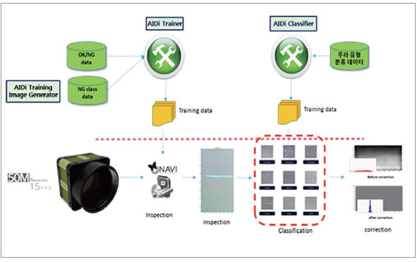 AIDi는 비정형 Mura, Bit, Dot 불량을 검사하기 위하여 저조도에 강인한 50Mega 이상의 고해상도 카메라로 촬영한 이미지를 Mura Training Image Generator 및 AIDi Trainer, AIDi Calssifier에 적용하여 검사 시 사용할 Training Data를 제작한다. Training Data를 사용하여 OLED 패널 검사를 진행하여 양품/불량 판정 및 불량 종류를 구분할 수 있다.