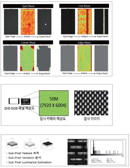 Sub-Pixel Level의 미세 얼룩 이미지를 AI를 이용하여 검사하며 미세 불량을 검출한다. OLED Sub-Pixel 구조에 따라 각 Red, Green, Blue별 Pixel 값을 추출하여 검사를 진행한다.