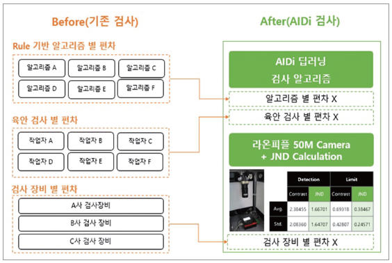 셋째, 품질 기준 표준화가 가능해진다. 정량화된 검사 Spec 적용을 통해 비정형 Mura 및 Bit, Dot 검사에 대한 작업자별 품질 편차 문제 해결, 품질 기준 표준화에 따른 품질 향상 및 제품 신뢰도가 개선된다.
