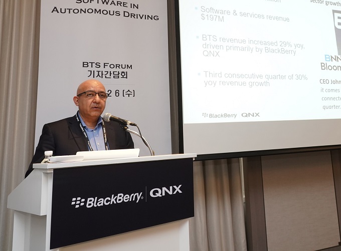 카이반 카리미(Kaivan karimi) 블랙베리 테크놀로지 솔루션 영업 수석 부사장은 12월 6일 기자간담회를 통해 소프트웨어와 보안의 중요도 높아지고 있는 자동차 시장의 트렌드와 자사의 오토모티브 비즈니스 전략에 대해 발표했다.