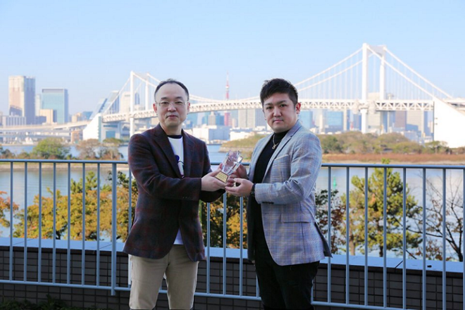 블록 스타 탑 100 수상자인 글로스퍼 재팬의 히데시 쿠보타 대표(오른쪽)가 기념촬영하고 있다.
