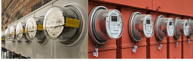 [그림 1a]에서 보듯이 전기 기계식 계량기는 회전 디스크와 게이지에 의해 판별되는 반면, 그림 1b의 e미터는 LCD를 통해 판독할 수 있다.
