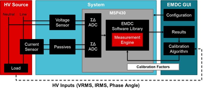 [그림 4]는 임베디드 미터링 시스템의 세 가지 주요 구성요소를 보여준다. 첫째, 고전압 소스는 정확한 테스트 장비 또는 AC 주 전원이 될 수 있다. 다음으로, 시스템은 MCU와 센서를 포함하는 평가 모듈 또는 커스텀 보드가 될 수 있다. 마지막으로, GUI 또는 호스트 MCU는 시스템의 MCU를 제어하고 통신한다. 여기서 EMDC GUI는 소프트웨어 라이브러리를 구성하면서 CPU 대역폭을 추정하고, 구성 오류 검사, MCU를 위한 소스 코드 생성, 시스템 보정을 수행하고 결과를 표시한다. 이 모든 것이 한 줄의 코드도 작성할 필요 없이 실행된다.