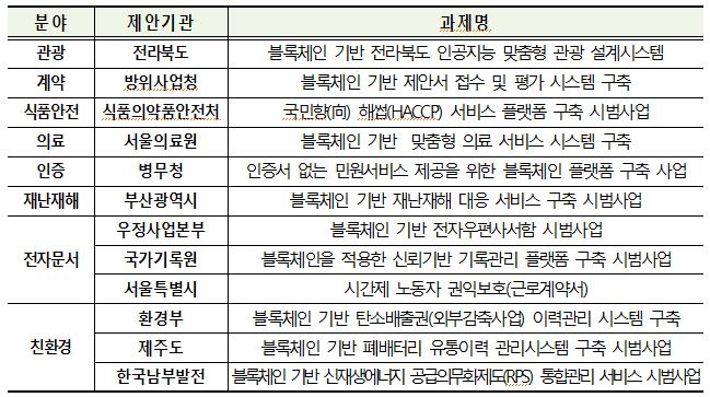 우선 공공선도 시범사업은 블록체인 기술을 공공부문에 선도적으로 도입․적용하여 공공서비스를 혁신하고 초기시장을 창출하기 위한 것으로, 2018년 6건(40억원)에서 2019년 12건(85억원)으로 확대하여 추진한다.