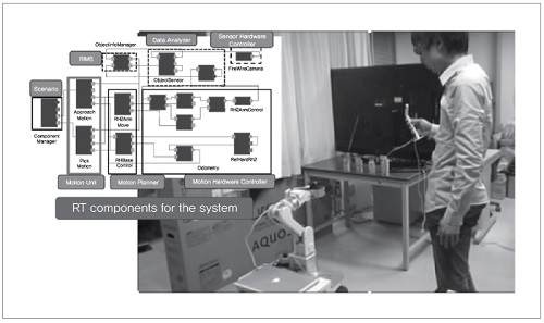 한편, 미들웨어 장점을 이용한 시스템의 한 예로서 NEDO의 차세대 로봇 지능화 기술 개발 프로젝트에서 개발한 음성인식에 의한 물체 조작을 가능하게 하는 시스템을 소개한다. 이 시스템 구축은 커뮤니케이션, 매니퓰레이션, 자율이동, 물체인식과 로봇 시스템에 요구되는 복수의 요소를 가진 시스템으로 되어 있으며, 일반적으로는 단시간에 실현하는 것이 쉽지 않은 대규모 시스템이었다(그림 1). 그러나 프로젝트 내에서 타 기관 등에서 개발되고 있던 RT 컴포넌트로서 이 글에서도 해설되고 있는 OpenHRI 등을 적절하게 재이용해 감으로써 시스템 구성 요소의 개발이 아니라, 통합해 애플리케이션에 맞춘 실장을 하는 것에 주력할 수 있었다. 일반적이라면 복수의 기관이 참여해야 할 시스템인데, 한 연구실 단위로 실현할 수 있었으며 플랫폼으로서 미들웨어의 우위성을 강하게 느낄 수 있는 개발이 됐다.