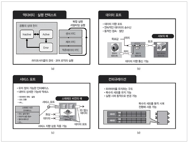 RTC 프레임워크가 제공하는 기능으로서는 주로 그림 2에 나타낸 4개의 기능이 있다. 실행 컨텍스트(그림 2 (a))는 RTC 공통의 상태 천이를 정의함으로써 다수의 RTC로 구성되는 시스템 제어를 쉽게 하는 동시에, 복수의 RTC 실행을 밀접하게 연계시키는 등 로직 실행 형태의 다양성을 실현하는 구조이다. 컴포넌트 간의 상호 작용을 실현하는 구조로서 데이터 포트와 서비스 포트가 제공되고 있다. 데이터 포트는 주로 통신 빈도가 높고 데이터를 주체로 한 하위층에서 이용되는 것을 가정(그림 2 (b)), 서비스 포트는 로봇 제어의 상위층이나 모듈의 상세 기능에 대한 액세스에서 이용하는 것을 가정해 설계됐다(그림 2 (c)). 또한, RTC의 재이용성을 향상시키기 위한 기능으로서, RTC 내부의 여러 가지 파라미터를 실행할 때에 외부에서 설정 가능하게 하는 컨피규레이션 기능을 갖추고 있다(그림 2 (d)).