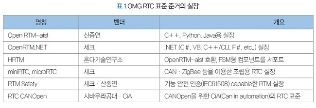 그 후 RTC 표준은 1번의 버전업을 거쳐 현재 버전 1.1이 되어 있다. 표준 사양의 공개에서 10년이 경과됐는데, 지금까지 RTC 표준 준거의 실장이 몇 가지 발표됐다(표 1). 또한, 혼다기술연구소가 개발하는 RT 미들웨어 : HRTM에서는 상태 천이형 컴포넌트의 프레임워크가 제안되어, 이것을 기초로 RTC 표준에 관련된 표준 사양으로서 FSM4RTC가 2016년 4월에 발효되는 등 표준 사양의 갱신이나 확장이 이루어지고 있다.