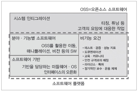 또한, 오픈소스 소프트웨어(OSS)를 이용할 때에 소프트웨어의 품질이나 라이선스 혹은 포함되는 특허 등의 문제 때문에 고도의 기능을 무상으로 이용할 수 있음에도 불구하고 실제 제품에 탑재할 수 없는, 혹은 탑재를 스스로 피한다고 하는 목소리도 듣는다. 이러한 기능에 직접 관여하지 않는 이른바 비기능 요건에 대해서도 대응할 필요성이 지적되고 있다.