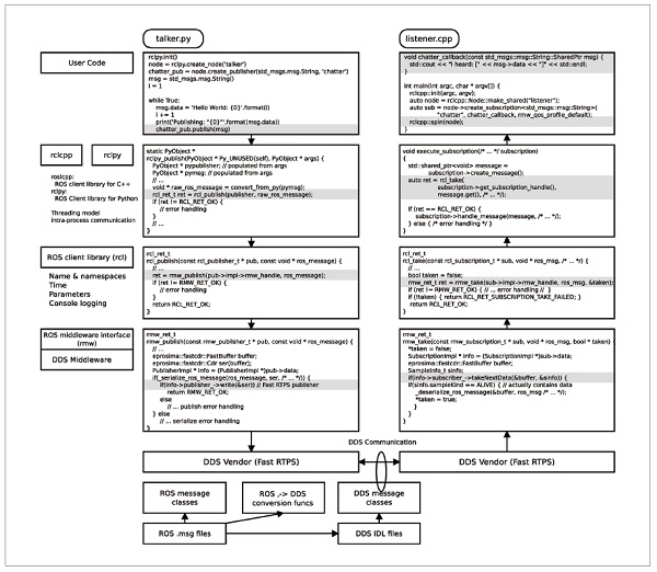 그림 5에 ROS2의 통신 아키텍처를 나타내고 있다. ROS2의 미들웨어는 DDS의 실장(여기에서는 Fast RTPS가 예로 되어 있는데, RTI Connext나 Opensplice도 이용 가능) 위에 rmw(ROS middleware Interface)라고 불리는 인터페이스를 준비하고 있다. 이것은 DDS 벤더에 의존하지 않고, 출판 구독이나 원격 함수 호출의 인터페이스를 제공하는 것이다. 또한, 그 위에 rcl(ROS client library)라고 불리는 C의 라이브러리가 존재, 이것이 통신계에 더해져 이름 공간, 시간, 로깅 등 ROS의 기본 기능을 제공하고 있다. 실제로 유저가 이용하는 rclcpp, rclpy, rcljava 등의 각각 C++, Python, Java 언어의 ROS2 클라이언트 라이브러리는 rcl 위에 구축되어 있다.