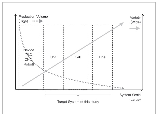 또한, 이 글은 생산 설비 중에서 그림 1에 나타낸 ‘소량(1~약 1000 이하)’ 그리고 ‘다종’ 제작되는 것을 대상으로 한다. 각종 디바이스를 조합해 유닛이 구성되고, 또한 그 조합으로 셀, 라인이 구성된다. 디바이스→유닛→셀→라인으로 규모가 커짐에 따라 제작 수는 감소하는데, 반대로 조합에 의한 다양성은 증대한다.