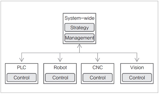 그러나 생산 시스템은 복잡하고 다기능이기 때문에 이들 기기의 단순한 조합으로 필요한 플렉시빌리티를 실현하는 것은 어려웠다. 그림 2에 나타냈듯이 생산 시스템을 구성하는 기기는 각각 독자의 처리 방책(Strategy)·관리 기능(Management)·제어 기능(Control)을 유지하고 있다. 그렇기 때문에 시스템 전체를 최적·플렉시블하게 하는 것은 어렵다.