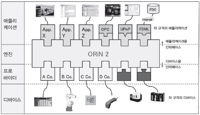 · 제어 방책 : 제어 애플리케이션 개발자는 ORiN이 제공하는 ‘애플리케이션용 인터페이스’를 이용함으로써 기기에 의존하지 않고 시스템 전체에서 통일된 제어 방책에 기초한 애플리케이션을 개발할 수 있게 된다. (앞에서 말한 ①에 대응)