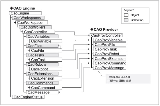 CAO의 오브젝트 트리를 그림 5에 나타냈다. ORiN에서는 기기가 갖는 기능을 Variable(변수), File(파일), Task(내장 프로그램), Robot(동작), Extension(확장 기능), Command(커맨드 기능) 등의 카테고리로 나누어 클래스 정의하고 있다. 또한, CAO의 아키텍처는 엔진부와 프로바이더부의 2층으로 분리되어 있으며, 오브젝트 모델도 2가지로 나누어져 있다. 프로바이더부의 모델은 컨트롤러 내의 대상 리소스와 거의 일대일로 대응하는 선언적인 심플한 모델로 되어 있다.