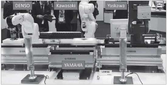 그림 8은 기존에 개발이 어려웠던 여러 메이커의 로봇 통합 제어 시스템 사례이다. 다른 4사(덴소웨이브, 가와사키중공업, 야마하발동기, 야스카와전기)의 로봇이 1대의 ORiN PAC에 접속되어, 그 지시 하에 연계 작업을 실현하고 있다.