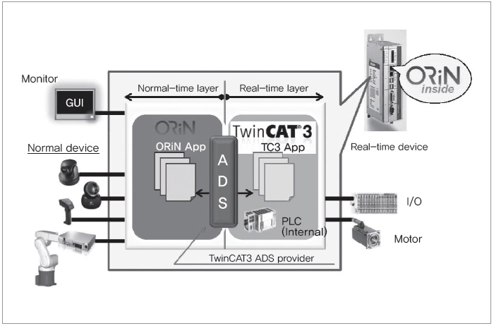 그림 9는 자동화 시스템용 리얼타임 확장 사례이다. 이 사례에서는 산업용 PC상에 Beckhoff사의 리얼타임 확장인 TwinCAT와 비리얼타임 처리를 담당하는 ORiN의 양쪽이 탑재, 양자가 ADS(Automation Device Specification)이라고 불리는 규격에 대응한 ORiN 프로바이더를 통해 내부 연계하고 있다. 이 구성에 의해 단일 PC 상에서 모션 제어, PLC 처리 등의 리얼타임 처리를 TwinCAT 상에서 실행시키면서 동시에 ORiN이 서포트하는 폭넓은 기기와 정보 교환하는 것도 가능해진다.