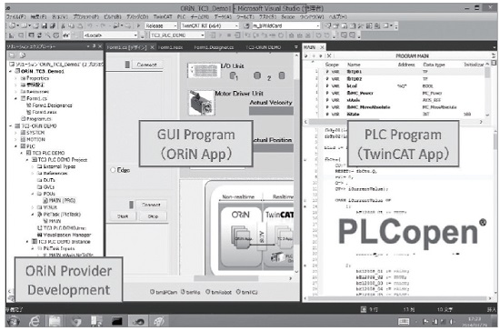 통합 개발 환경의 사례를 그림 11에 나타냈다. 이 사례에서는 ORiN PAC 전체를 제어하는 GUI 애플리케이션, 설비 제어를 담당하는 PLC 프로그램, ORiN과 기기를 접속하기 위한 프로바이더의 3가지를 Microsoft Visual Studio 상에서 통합해 개발하고 있다.