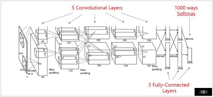 앞서 살펴본 AlexNet의 구조는 그림과 같다. AlexNet은 2개의 GPU를 활용하는 구조를 취하고 있으며, 필요에 따라 inter-GPU/intra-GPU 통신 구조를 취하고 있다.
