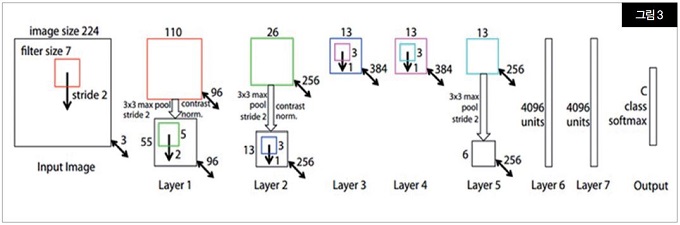 위 그림2의 (b)와 (d)는 AlexNet의 1/2단계 feature를 보여주는 것이고, (c)와 (e)는 ZFNet의 결과를 보여준다. AlexNet보다는 ZFNet의 결과가 훨씬 더 좋다는 것은 그림 만으로도 쉽게 이해가 간다. AlexNet은 일부 feature에 몰리는 현상도 있었고, aliasing 문제도 발생을 하였지만, ZFNet은 다양한 feature가 고르게 나타나는 것을 볼 수 있다. 당연히 AlexNet보다는 ZFNet을 이용한 결과가 좋게 나올 수밖에 없다. 그럼 아래 그림3을 한번 보자. 아래 그림은 ZFNet의 구조이다. ZFNet도 AlexNet과 동일하게 GTX580 GPU를 사용하였다. 단, AlexNet과 달리, 2개의 GPU를 사용하지 않고, 1개의 GPU를 사용하였다. ILSVRC 영상을 할 때 70 epoch에서 멈추었으며, 1개의 GPU를 사용하여 총 12일 동안 학습을 시켰다고 한다.