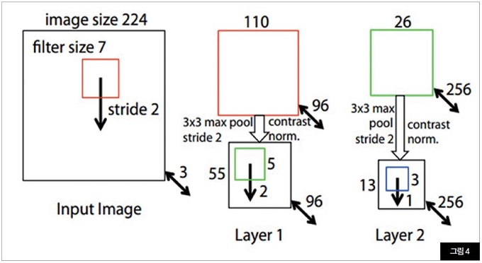 ZFNet은 자신들의 Feature Visualization 기법의 효과를 보이는 것에 집중을 했기 때문에 전반적으로 AlexNet과 비슷한 구조를 취했다. 단, 첫번째와 두번째 layer는 구조가 다르다는 것을 알 수 있다. 아래 그림4는 확대한 그림이다.
