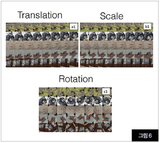 아래 그림6은 크기, 위치 및 회전 이동에 사용할 테스트 이미지들이다. 작은 변화에 대해서도 앞쪽 layer에서는 눈에 띌 정도의 변화가 있지만, 뒤로 갈수록 invariance를 얻을 수 있음을 실험으로 파악하였다. 또한 위치 이동과 크기 변화에 대해서는 거의 linear한 특성을 얻을 수 있었다.