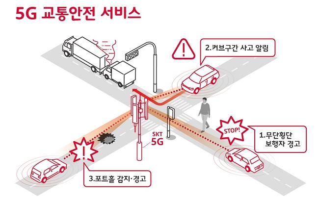 5G 기반 미래형 교통 체계가 구축되면 30여가지 새로운 안전 서비스가 가능해진다. 예를 들어 5G는 도로에 설치된 검지기를 통해 무단 횡단하는 보행자를 주변 차량에 경고해 사고를 미연에 방지해준다. 5G검지기는 야간·악천후에도 무단횡단자를 인식할 수 있다.