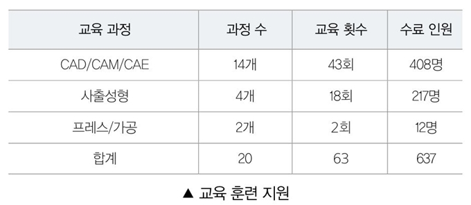한편, 센터는 금형기술 인력 교육 훈련에도 힘썼다. CAD/CAM/CAE, 사출성형 이론·실습 등 체계적인 교육 훈련을 진행해 금형업계의 애로사항인 전문 인력 양성에 기여했다. 상세 내용은 다음과 같다.