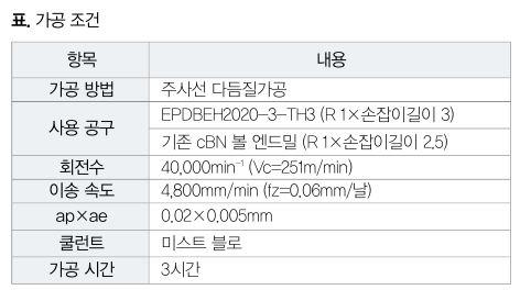 또한 절삭공구는 고속으로 업컷의 다듬질 측면 절삭에 적합한 설계의 ‘왼쪽 비틀림각을 가지는 특수 소경 엔드밀’을 이용했다.