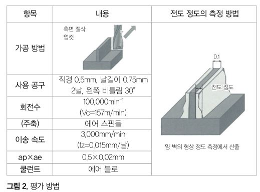 이 연구에서는 그림 2에 나타냈듯이 축방향 절입량을 0.5mm로 크게 날길이를 사용한 측면 절삭(업컷)으로, 절삭 속도를 확보하기 위해 회전수를 100,000min-1(절삭 속도 157m/min)로 하고 이것에 의해 이송 속도를 3,000mm/min이라는 경이적이 스피드로 고속으로 가공하는 방법을 검토하고 있다.