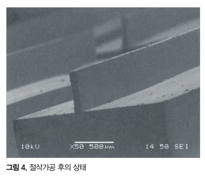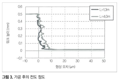 가공한 피삭재의 윤곽 형상 정도의 변화를 그림 3에 나타냈다. 절삭 거리가 1.3m 시점의 한쪽 측 전도 정도는 5μm 이내이고, 이 부근의 벽면 가공면 조도도 Rz 0.425μm로 양호했다. 가공 후의 워크 상태를 그림 4에 나타냈다. 동 그림으로도 알 수 있듯이 이 연구에서 이용한 왼쪽 비틀림 공구의 형상 효과로서 상단부의 버도 매우 작고, 또한 바닥면의 가공면에도 공구 회전방향에 의한 커터마크가 적은 양호한 면을 얻을 수 있었다.