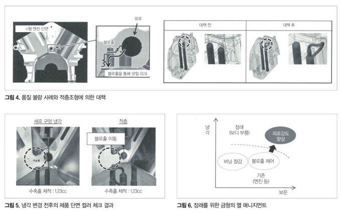 적층조형 기술의 적용에 의해 제품 품질 향상에서 효과를 올린 실례를 소개한다. 그림 4에 나타낸 엔진의 블록 실린더에서는 유로로부터 블로홀을 타고 오일 리크 불량이 발생하고 있었다. 이에 리크부 위치 아래의 금형에 적층조형 기술을 적용해 면 따라 냉각을 형성함으로써 금형의 냉각 능력을 강화했다.