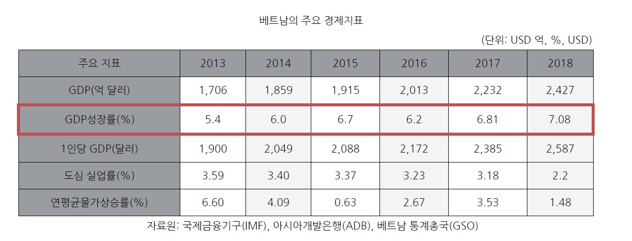 ’18년 베트남 경제는 당초 정부의 목표치(6.5-6.7%)를 뛰어넘어 7.08%의 성장률을 달성했다. 지난해 12월 27일 베트남 통계청이 발표한 ‘2018년 경제·사회 현황’ 자료에 따르면, ’18년 베트남의 GDP(국내 총 생산량)는 전년 대비 7.08% 증가했다. 이는 당초 정부 목표치(6.5-6.7%)는 물론 각 국제 금융 기구의 전망치를 상회하는 성과이자, 2008년 이래 최고 경제 성장률이기 때문에 주목할 만하다.