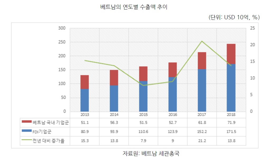 특히, 2018년도 베트남의 수출액은 FDI 기업군이 1천715 억 달러를 기록하면서 총 수출액의 70% 차지해 베트남의 수출 증대에 FDI 기업이 기여하는 비중이 압도적임을 보여준다.