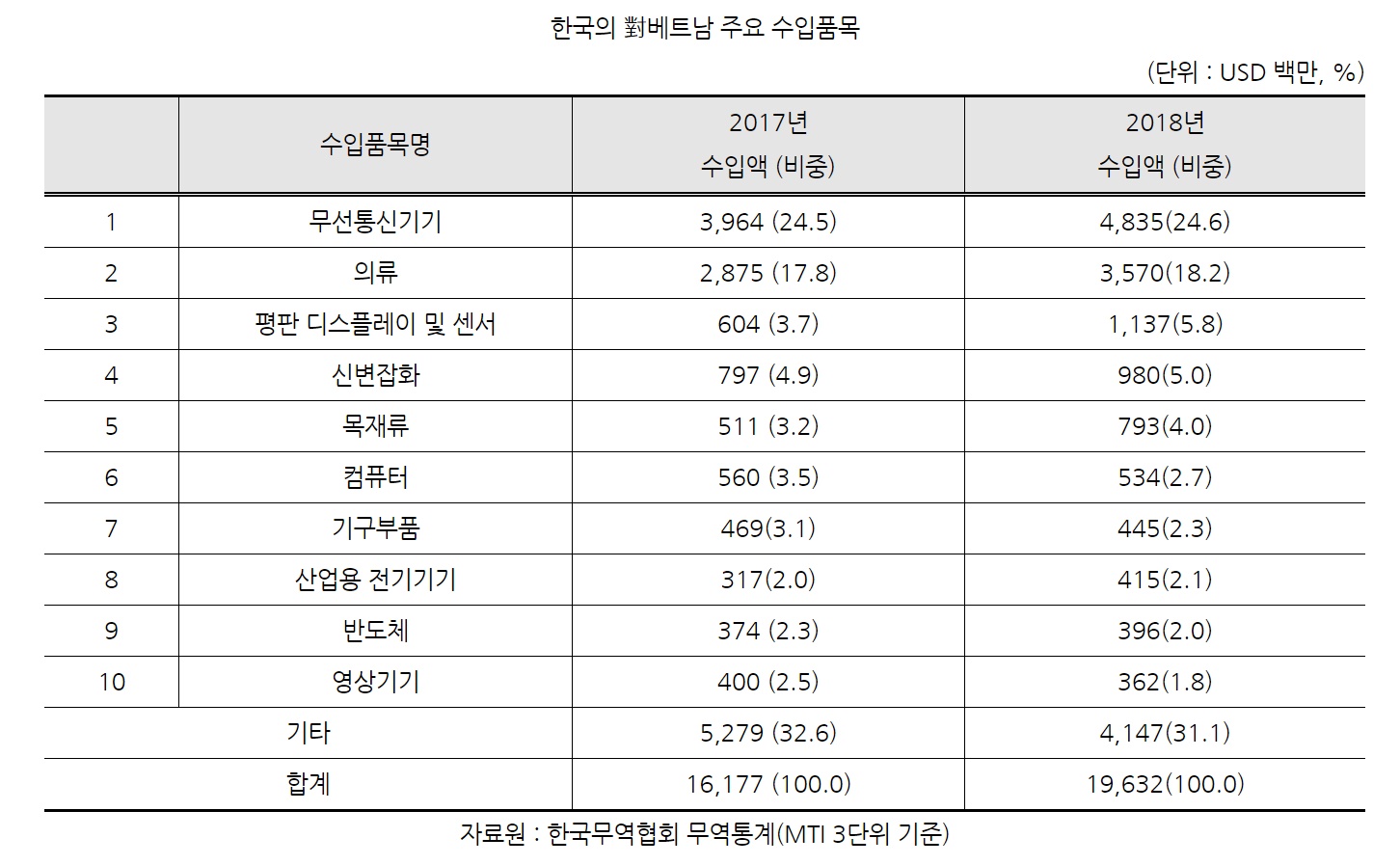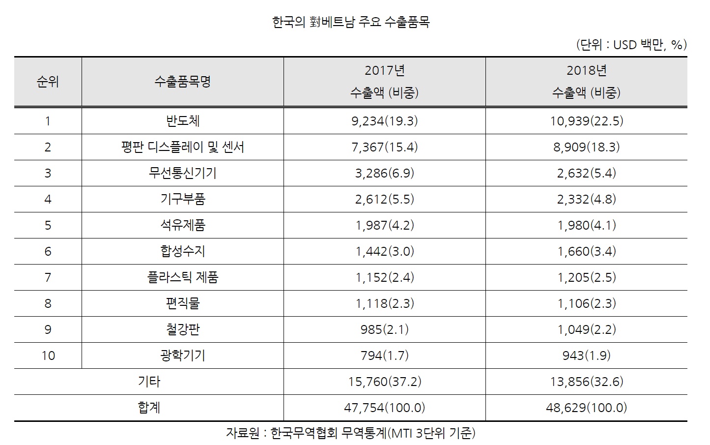 對베트남 주요 수출품은 반도체·평판 디스플레이, 주요 수입품은 의류·무선통신기기로 수출을 보면, 반도체 수출액이 109억 달러로 전년대비 18.5% 증가했으며 평판 디스플레이 및 센서 수출액은 89억 달러로 전년대비 20.9% 증가했다. 무선통신기기(-19.9%), 기구부품(-0.8%), 석유제품(-0.4%)은 전년대비 수출 증감률이 하락했다.