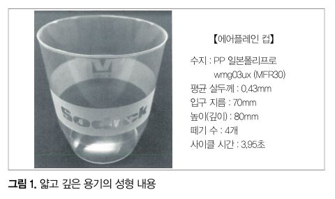 이번에 OPM 시리즈로 조형한 얇고 깊은 용기용 금형에 의한 하이사이클 성형 사례를 소개한다. 성형한 수지는 폴리프로필렌으로, 투명성이나 내충격성을 중시해 유동성이 MFR(Melt Flow Rate) 30의 비교적 잘 흐르지 않는 특성을 가지고 있다(그림 1). 사출성형기는 동사 제품인 MS200을 사용했다.