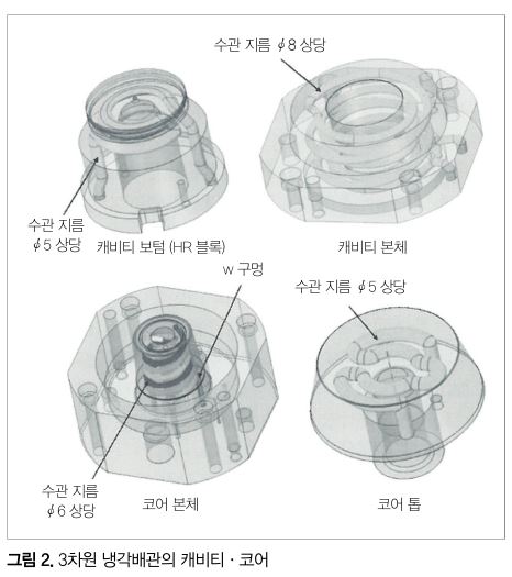 금형에 의한 수지 성형에서는 냉각 시의 수축을 고려할 필요가 있다. 기존의 금형 제조 방법은 가공 범위가 제한되기 때문에 2차적인 냉각배관만 가능했다. 그러나 OPM 시리즈를 사용함으로써 3차원적으로 냉각배관을 캐비티․코어에 3차원 냉각배관을 실시한 예를 그림 2에 나타냈다.