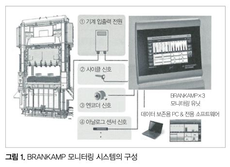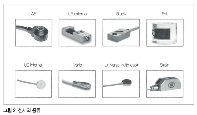 이 시스템의 구성 예를 그림 1에 나타냈다. 프레스 기계 본체나 금형에 장착하는 센서(그림 2)의 위치와 개수는 기계의 종류나 감시 목적에 따라 다르지만, 최적의 위치에 장착함으로써 프레임이나 금형 내에 걸리는 하중이나 진동, 변형 등을 취득할 수 있다.