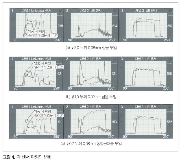 취득한 파형을 그림 4에 나타냈다. 양품 시의 파형과 비교해 공통적으로 크게 변화가 나오고 있는 것은 채널 1의 Universal 센서와 채널 2의 UE 센서이다. 슬래그의 투입 위치에 따라 파형 변화가 큰 부위가 있다는 것을 알 수 있다. 또한 심의 두께나 치수가 크고 두꺼워지면, 센서 파형의 변화도 커진다는 것을 알 수 있다.