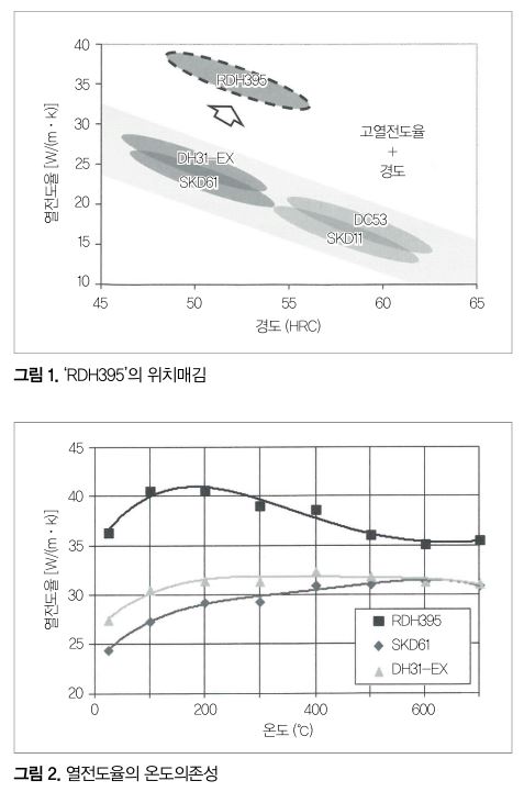 그림 1에 RDH395의 열간 다이스강(범용강 JIS SKD61, 동사 개발강 DH31-EX), 냉간 다이스강(범용강 JIS SKD11, 동사 개발강 DC53)과의 위치매김을 나타냈다. 앞에서 말했듯이 RDH395는 열전도율에 특화하고 있으며, 열간 다이스강의 경도를 유지하면서 기존에 없는 고열전도율을 갖는 강종이다.