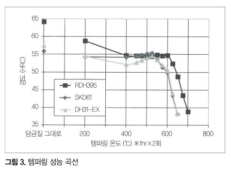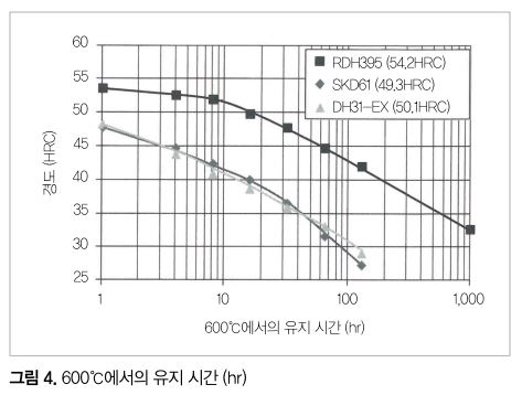 기존 강이 10hr 유지 후에 약 40HRC로 연화되고 있기 때문에 RDH395의 연화저항은 기존 강 대비 10배 이상으로 매우 우수하다. 핫 스탬핑 공법에서는 테일러드 템퍼링이나 성형부하가 높은 부분에서 금형이 고온에 노출되는 경우가 있기 때문에 연화에 동반하는 마모나 소성변형 등의 금형 손상이 염려된다. RDH395의 우수한 연화저항은 그러한 손상에 대해 유효하다고 생각된다.