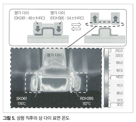 그림 5에 핫 스탬핑 성형 시험에서 금형 표면의 형열림 직후의 온도를 나타냈다. 900℃에서 5min 가열한 Al 도금 강판을 연속으로 성형, 일정 숏 수 이상에서 온도가 안정된 후에 서모뷰어를 이용해 온도를 측정했다. RDH395의 표면 온도는 JIS SKD61 대비 약 20℃ 낮게 되어 있으며, 고열전도율을 가진 RDH395의 높은 냉각능을 확인했다. 이 결과로부터 RDH395의 적용으로 강판의 발열이 빨라지는 것이 시사되어, 사이클 타임 향상에 대한 공헌이 증명됐다.