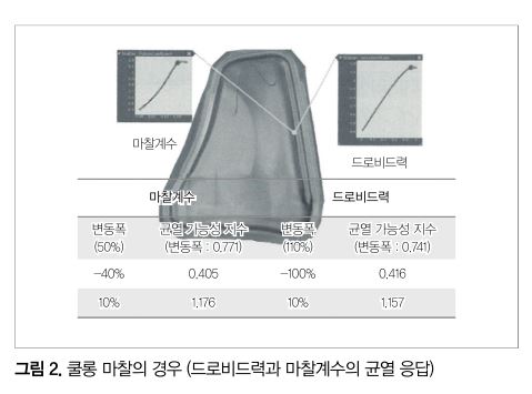 기존의 판성형 해석에서는 자주 사용되고 있던 쿨롱 마찰칙의 마찰계수 0.5를 기준으로 해서, 설계 파라미터로서의 타당성을 검토하기 위해 드로비드력과의 감도를 조사한 결과를 그림 2에 나타냈다. 노미널 기준에 대해 드로비드력의 변동폭 100%(-100% : 드로비드력이 0/+10%는 최대 드로비드력)를 부여한 경우에는 균열 가능성의 응답 변동폭이 0.741인 감도에 대해, 쿨롱 마찰계수 0.15에서 변동폭 50%(-40%/+10%)에서는 균열 가능성의 응답 변동폭이 0.771로, 마찰 조건이 지배적인 결과가 됐다.