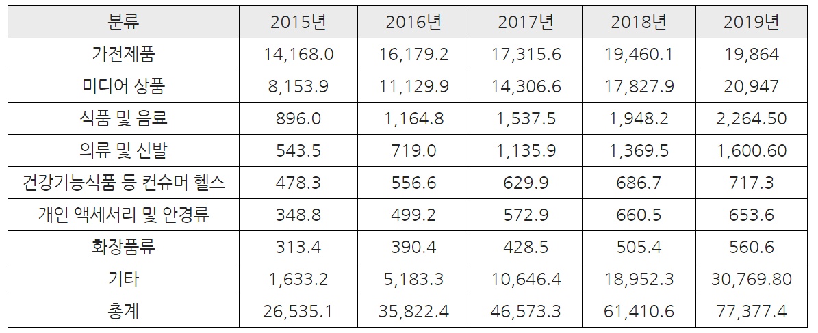 주요 생활소비재에 속하는 식품 및 음료 그리고 의류 및 신발의 거래 규모가 빠른 속도로 증가하고 있으며 유로모니터는 2019년에 해당 품목의 거래 규모가 2015년에 비해 약 3배 가까이 성장할 것으로 전망하고 있다(표 2).