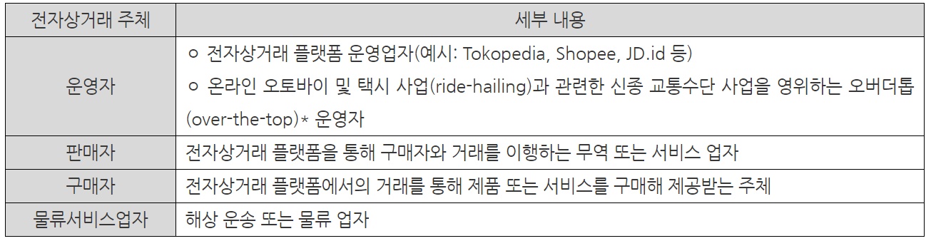 이 법의 제 3조에 의하면 정부는 전자상거래(E-Commerce)를 표 3과 같은 디지털 플랫폼을 통해 진행되는 거래로 정의한다.