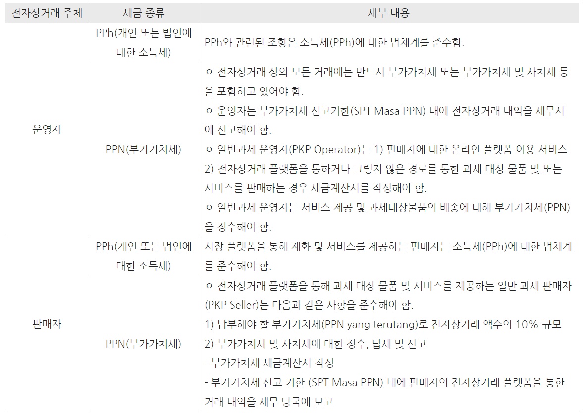 (사치세) 사치세는 재무부 장관령 2017년 제 33조(No.33/PMK.010/2017)와 제 35조(No. 35/PMK.010/2017)의 규정이 전자상거래 물품에도 적용된다. 재무부 장관령 2018년 제210호에서 운영자와 판매자에 대해 표 6과 같이 조세 징수, 납부, 신고 규정이 명시돼 있다.