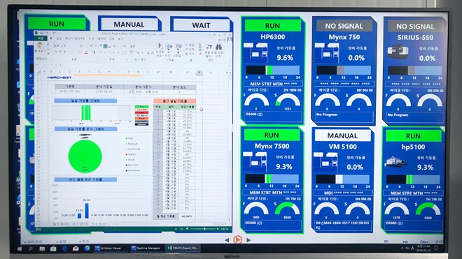한편, M-VISION Plus는 필요한 정보를 한눈에 손쉽게 확인한다. 메인 화면을 통해 현장에서 필요로 하는 데이터만 텍스트가 아닌 그래픽으로 표현해 준다. 이 화면을 통해 누구나 직관적으로 현재 가동 상태를 실시간으로 확인할 수 있고, 필요하다면 가공 이력을 기간별, 공정 별로 상세하게 분석해 그래프 또는 별도 엑셀 파일로 확인할 수 있다.