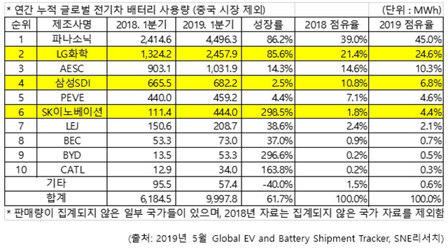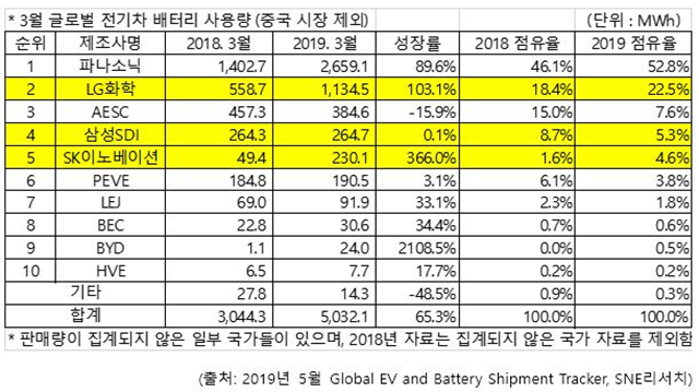 올해 1월부터 3월까지 판매된 글로벌 전기차(EV, PHEV, HEV)에 탑재된 배터리 사용량 순위가 나왔다. 이번 순위는 중국에서 출시된 전기차에 탑재된 중국산 배터리 사용량은 제외했다. 이번 순위에서 LG화학과 삼성SDI는 각각 2위와 4위 자리를 고수했다. SK이노베이션은 6위로 전년 동기 대비 한 계단 올라섰다.