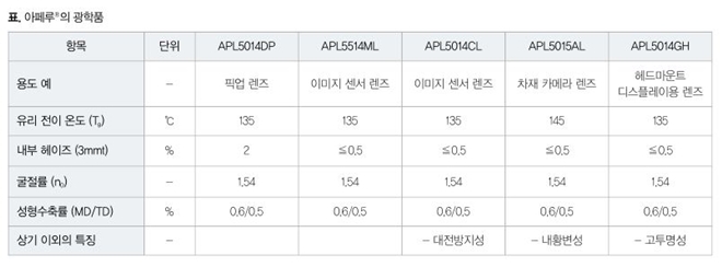 차재 카메라 렌즈 용도로 요구되는 내열 온도는 스마트폰용 카메라 렌즈에 비해 높다. 그렇기 때문에 이미지 센서 렌즈용 상품(APL5014CL, APL5514ML)은 내열성이 부족했다. 이에 장기 내열성이나 고온․고습 내성 등 차재 카메라 렌즈 용도의 요구특성에 대응해 동사가 개발한 것이 APL5015AL이다. APL5015AL의 특징은 이미지 센서 렌즈용 상품보다 유리 전이 온도가 높고, 장기 내열시험의 내황변성이 우수한 것을 들 수 있다.