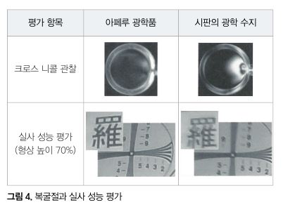 이 렌즈를 이용해 실사 성능을 평가하면, 아페루는 양호한 화질을 얻을 수 있다는 것이 실증되어 있다(그림 4 아래). 이 결과로부터 저복굴절의 재료인 아페루를 렌즈에 이용함으로써 이미지 센서의 화질이 향상되는 것이 밝혀졌다.