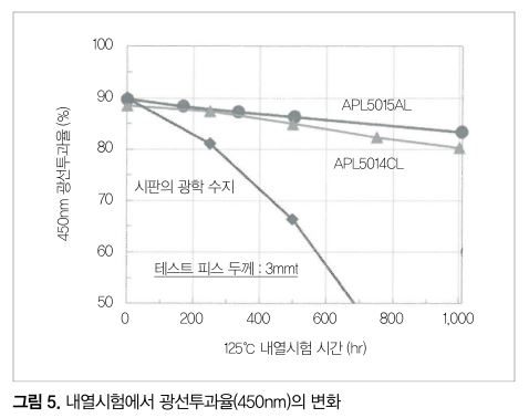 APL5015AL의 내황변성을 APL5014CL 및 시판의 광학 수지와 비교한 결과를 그림 5에 나타냈다. 이 시험에서는 3mm 두께의 테스트 피스를 125℃의 공기 분위기에 1,000시간 노출, 황변의 지료로서 450nm의 광선투과율의 경시 변화를 측정했다.
