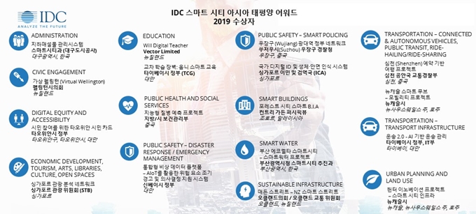 IT 시장분석 및 컨설팅 기관인 인터내셔날 데이터 코퍼레이션 코리아(International Data Corporation Korea Ltd., 이하 한국IDC)는 2019 스마트 시티 아시아 태평양 어워드(Smart City Asia Pacific Awards, SCAPA)에서 12개의 기능별 스마트 시티 수상 부문에서 총 17개의 우수 스마트 프로젝트를 선정했다고 10일 밝혔다.